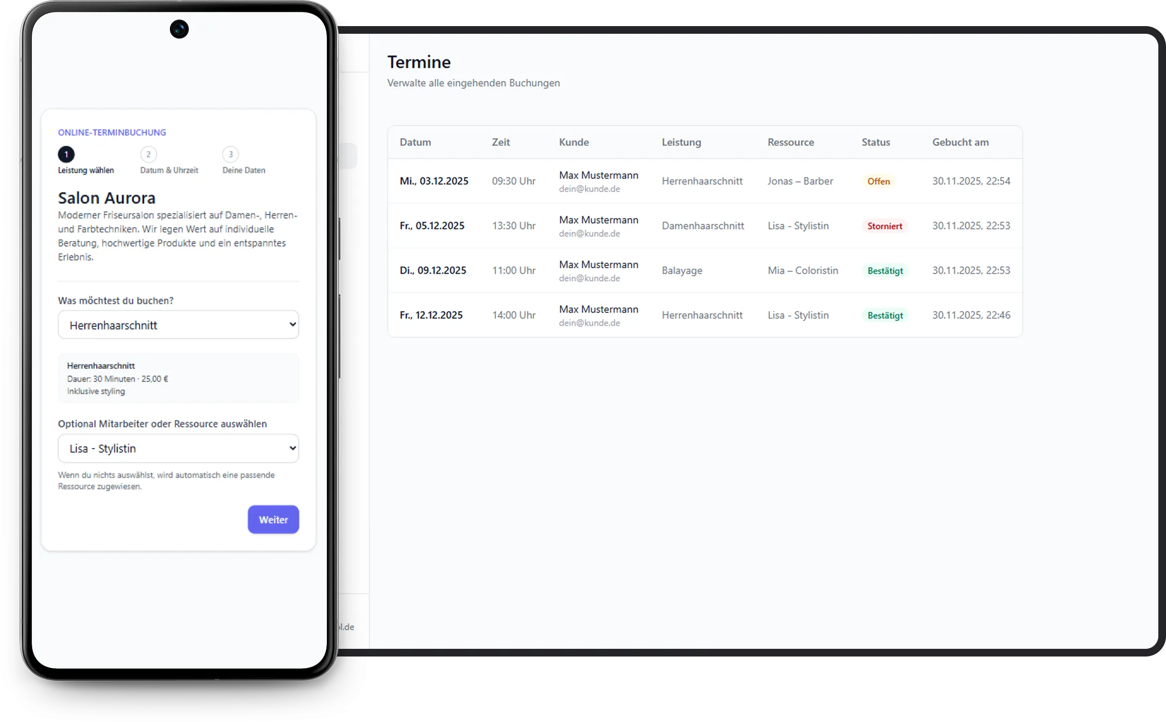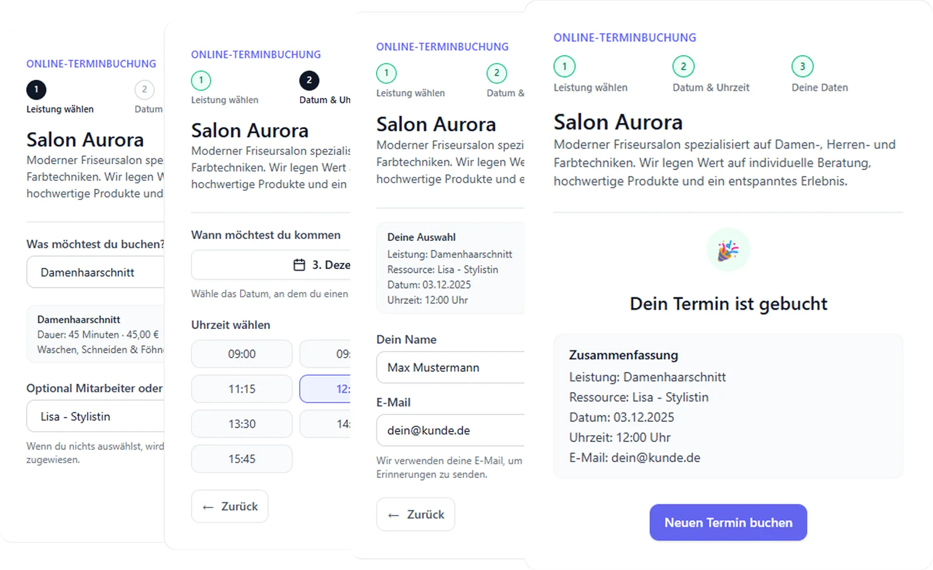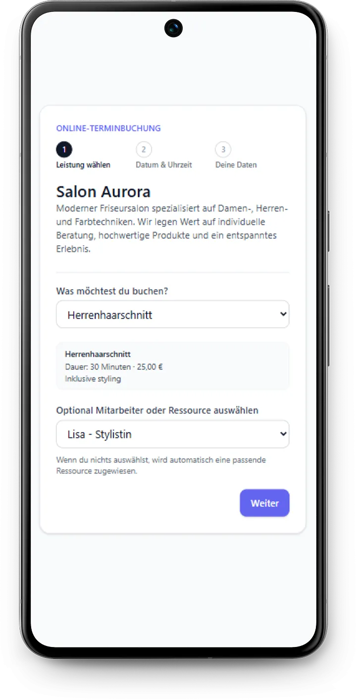 Kund*innen wählen Leistung, Datum und Uhrzeit. Ohne App, ohne Registrierung, direkt vom Handy.