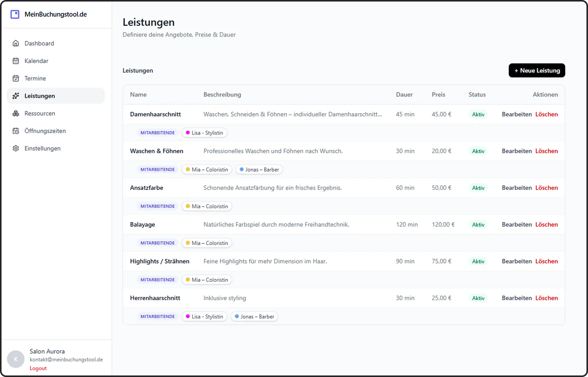 Du kannst mehrere Mitarbeiter*innen als Ressourcen anlegen und sie Leistungen zuordnen.